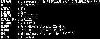 | FiLENAME: | Schoene.neue.Welt.S01E03.GERMAN.DL.720P.WEB.X264-WAYNE.mkv |