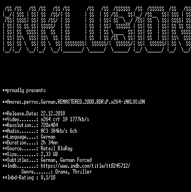 | FiLENAME: | Amores.perros.German.REMASTERED.2000.BDRiP.x264-iNKLUSiON.mkv |