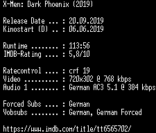 | FiLENAME: | X-Men.Dark.Phoenix.German.2019.AC3.BDRip.x264-COiNCiDENCE.mkv |