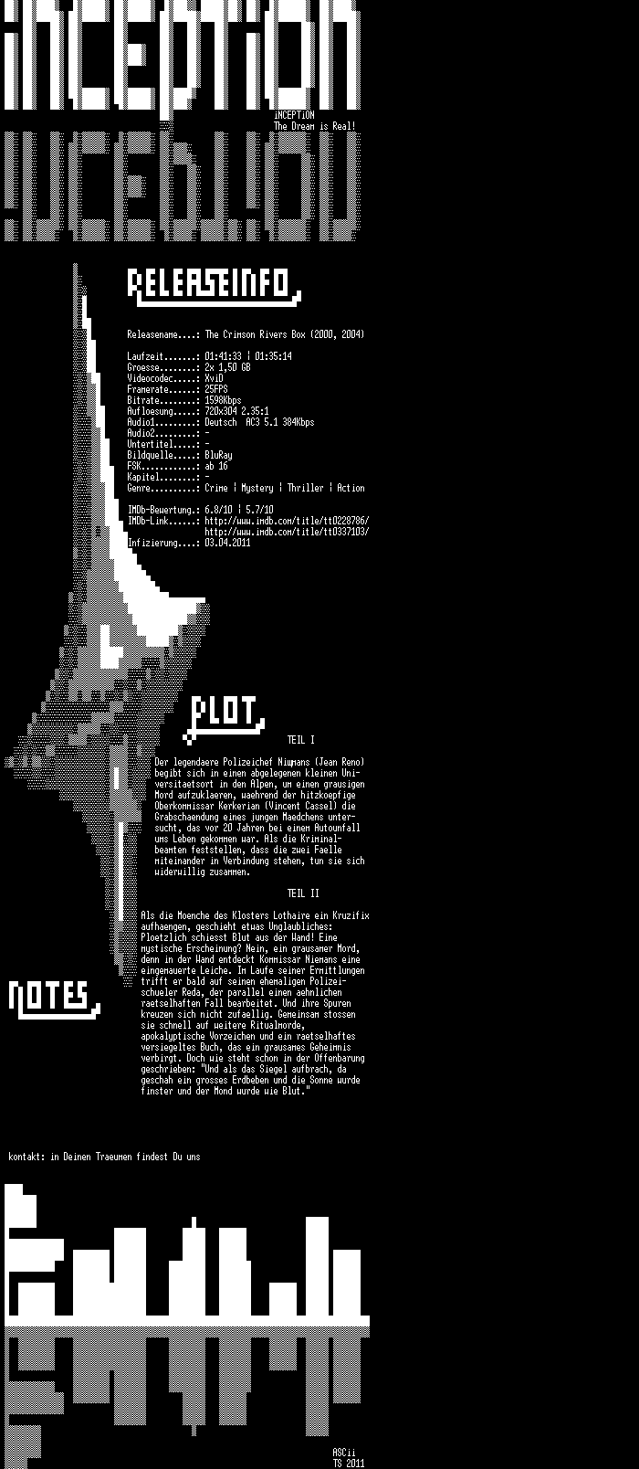 | FiLENAME: | Die.Purpurnen.Fluesse.2000.German.AC3.BDRip.XviD-iNCEPTiON.avi |