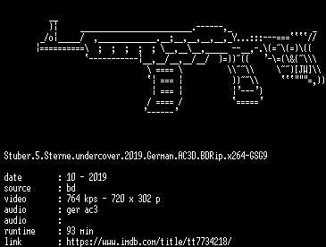 | FiLENAME: | Stuber.5.Sterne.undercover.2019.German.AC3D.BDRip.x264-GSG9.mkv |