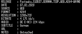 | FiLENAME: | Pastewka.S10E07.GERMAN.720P.WEB.H264-WAYNE.mkv |