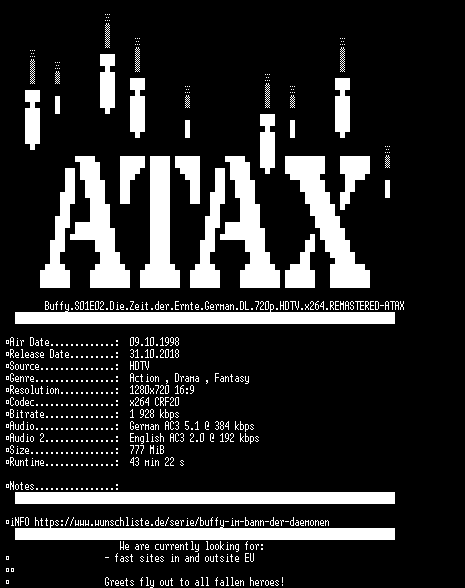| FiLENAME: | Buffy.S01E02.Die.Zeit.der.Ernte.German.DL.720p.HDTV.x264.REMASTERED-ATAX.mkv |