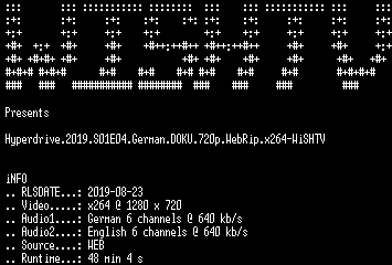 | FiLENAME: | Hyperdrive.2019.S01E04.German.DOKU.720p.WebRip.x264-WiSHTV.mkv |