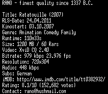 | FiLENAME: | Ratatouille.German.2007.AC3.BDRiP.XviD.iNTERNAL.HAPPY.EASTER-RANO.avi |