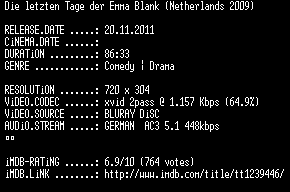 | FiLENAME: | Die.letzten.Tage.der.Emma.Blank.German.2009.AC3.BDRiP.XviD-PRiViLEGED.avi |