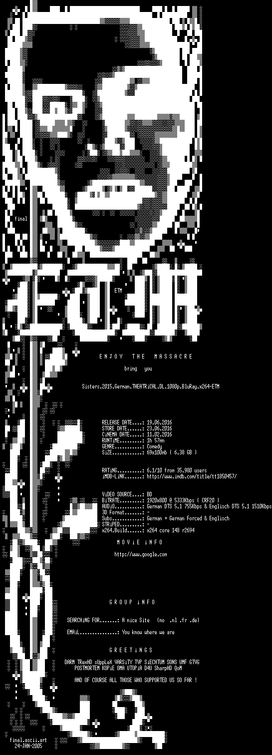 | FiLENAME: | Sisters.2015.German.THEATRiCAL.DL.1080p.BluRay.x264-ETM.mkv |