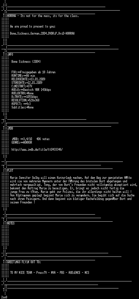 | FiLENAME: | Bone Sickness (2004) [GER WS DVD].avi |