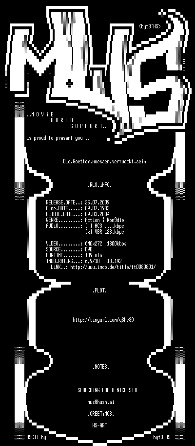 | FiLENAME: | Die.Goetter.muessen.verrueckt.sein.German.1980.DVDRiP.XviD.iNTERNAL-MWS.CD2.avi |