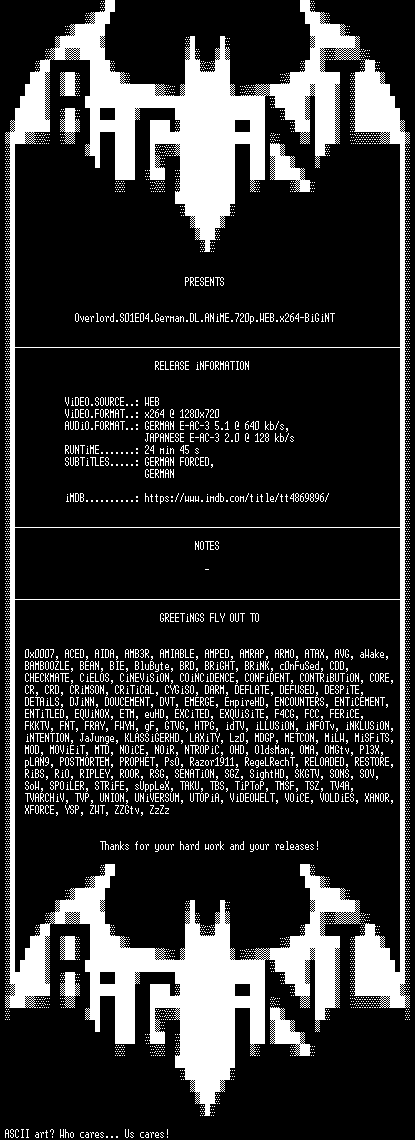 | FiLENAME: | Overlord.S01E04.German.DL.ANiME.720p.WEB.x264-BiGiNT.mkv |