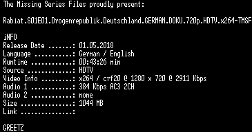 | FiLENAME: | Rabiat.S01E01.Drogenrepublik.Deutschland.GERMAN.DOKU.720p.HDTV.x264-TMSF.mkv |