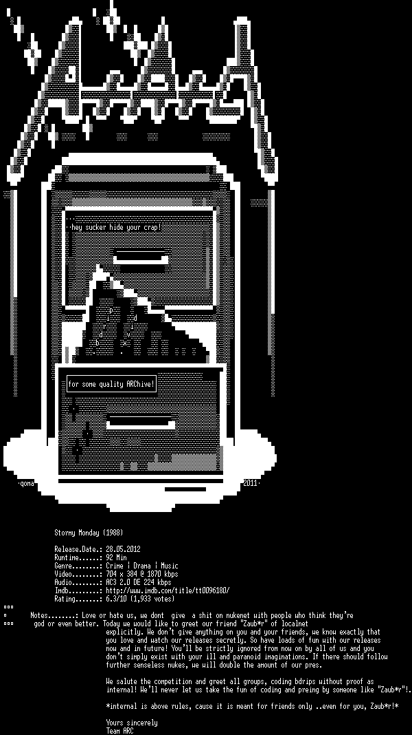 | FiLENAME: | Stormy.Monday.German.1988.READ.NFO.AC3.BDRip.XviD.INTERNAL-ARC.avi |