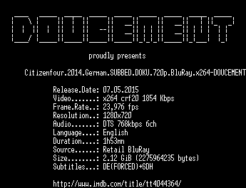 | FiLENAME: | Citizenfour.2014.German.SUBBED.DOKU.720p.BluRay.x264-DOUCEMENT.mkv |