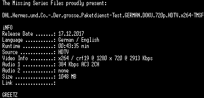 | FiLENAME: | DHL.Hermes.und.Co.-.Der.grosse.Paketdienst-Test.GERMAN.DOKU.720p.HDTV.x264-TMSF.mkv |