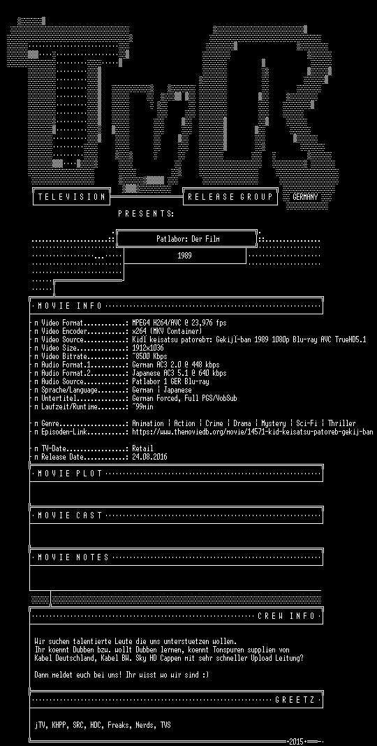 | FiLENAME: | Patlabor.Der.Film.GERMAN.DUBBED.DL.AC3.ANiME.BDRiP.1080p.WS.x264-TvR.mkv |