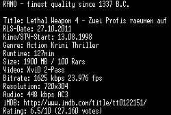 | FiLENAME: | Lethal.Weapon.4.Zwei.Profis.raeumen.auf.German.1998.AC3.BDRiP.XviD.iNTERNAL-RANOCLASSiCS.avi |