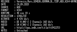 | FiLENAME: | Veronica.Mars.S04E06.GERMAN.DL.720P.WEB.X264-WAYNE.mkv |
