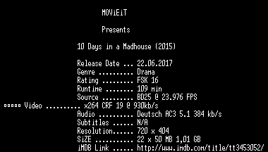| FiLENAME: | 10.Days.in.a.Madhouse.German.2015.AC3.BDRip.x264-MOViEiT.mkv |