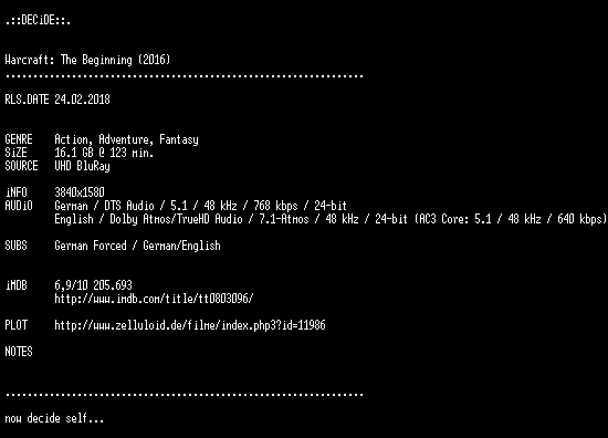 | FiLENAME: | Warcraft.The.Beginning.2016.GERMAN.DL.2160p.UHD.BluRay.x265-DECiDE.mkv |