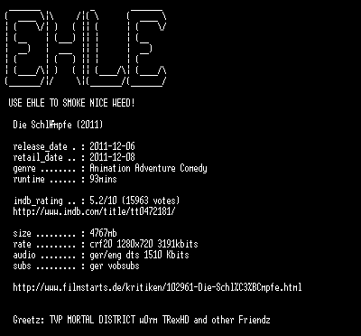 | FiLENAME: | Die.Schluempfe.German.DL.720p.BluRay.x264-EHLE.mkv |