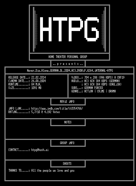 | FiLENAME: | Never.Die.Alone.GERMAN.DL.2004.AC3.DVDRiP.X264.iNTERNAL-HTPG.mkv |