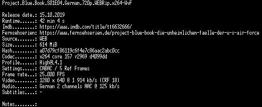 | FiLENAME: | Project.Blue.Book.S01E04.German.720p.WEBRip.x264-WvF.mkv |