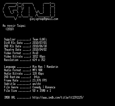 | FiLENAME: | Yi.ye.Taibei.2010.DVDRip.XviD-GiNJi.avi |