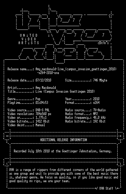 | FiLENAME: | Amy_macdonald-live_(campus_invasion_goettingen_2010)-x264-2010-uva.mkv |
