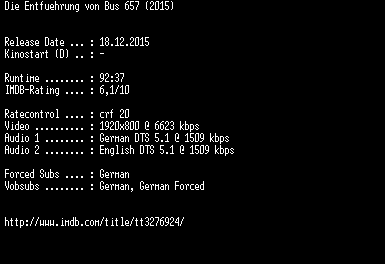 | FiLENAME: | Die.Entfuehrung.von.Bus.657.2015.German.DTS.DL.1080p.BluRay.x264-EXQUiSiTE.mkv |