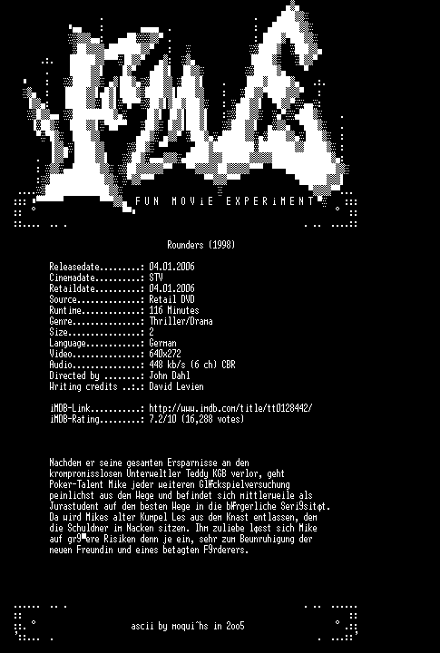 | FiLENAME: | Rounders.German.AC3.1998.DVDRiP.XviD-FmE.CD1.avi |