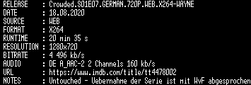 | FiLENAME: | Crowded.S01E07.GERMAN.720P.WEB.X264-WAYNE.mkv |