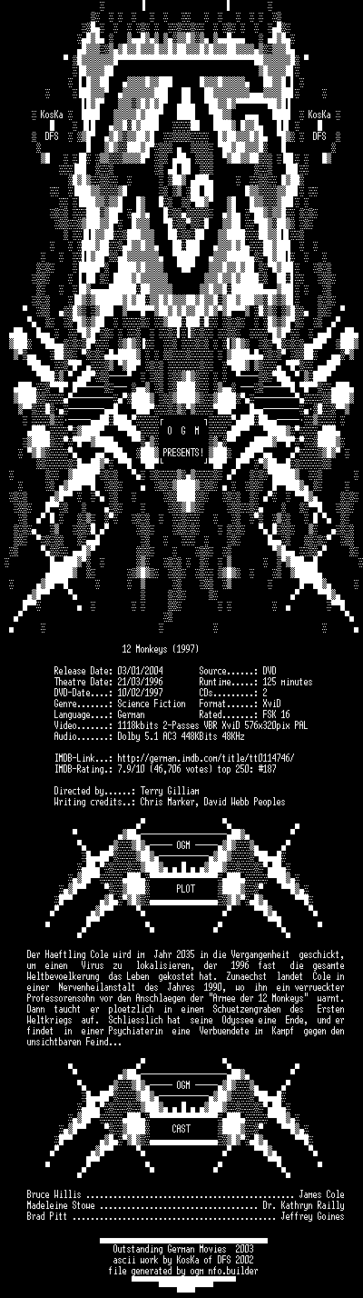 | FiLENAME: | 12 Monkeys (1997) [GER-AC3 WS DVD] CD1.avi |