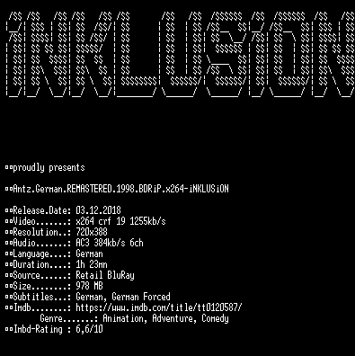 | FiLENAME: | Antz.German.REMASTERED.1998.BDRiP.x264-iNKLUSiON.mkv |