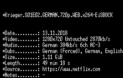 | FiLENAME: | Krieger.S01E02.GERMAN.720p.WEB.x264-EiSBOCK.mkv |