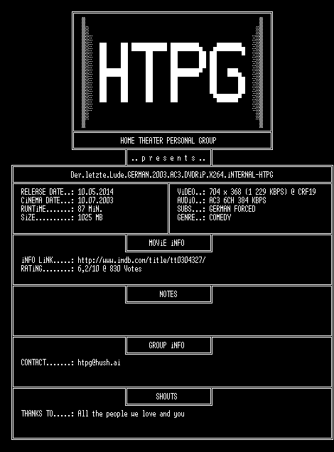 | FiLENAME: | Der.letzte.Lude.GERMAN.2003.AC3.DVDRiP.X264.iNTERNAL-HTPG.mkv |