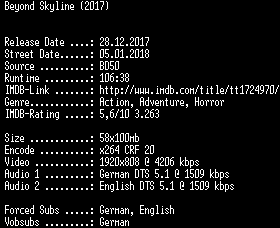 | FiLENAME: | Beyond.Skyline.2017.German.DL.1080p.BluRay.x264-SPiCY.mkv |
