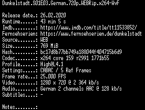 | FiLENAME: | Dunkelstadt.S01E03.German.720p.WEBRip.x264-WvF.mkv |
