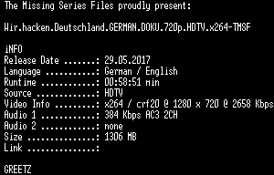 | FiLENAME: | Wir.hacken.Deutschland.GERMAN.DOKU.720p.HDTV.x264-TMSF.mkv |