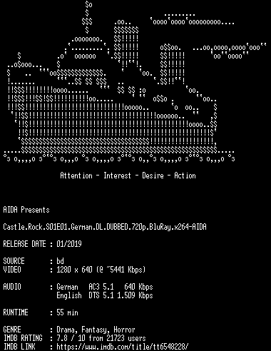 | FiLENAME: | Castle.Rock.S01E01.German.DL.DUBBED.720p.BluRay.x264-AIDA.mkv |