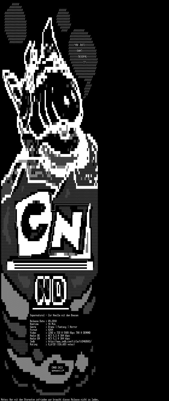 | FiLENAME: | Supernatural.S13E01.Abschied.German.DL.DUBBED.720p.BluRay.x264.REPACK-CNHD.mkv |