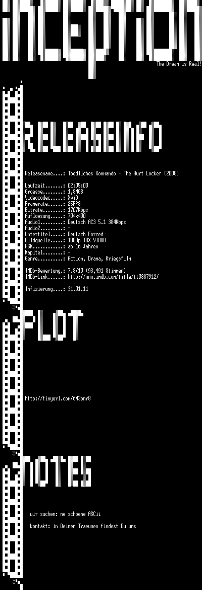 | FiLENAME: | Toedliches.Kommando.The.Hurt.Locker.2008.German.AC3.HDRip.XviD-iNCEPTiON.avi |