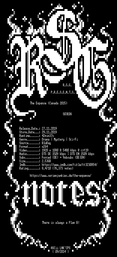 | FiLENAME: | The.Expanse.S03E06.German.DL.1080p.BluRay.x264-RSG.mkv |