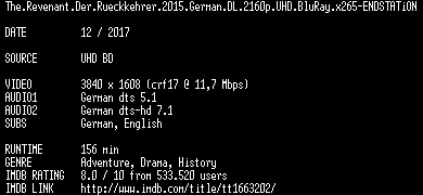 | FiLENAME: | The.Revenant.Der.Rueckkehrer.2015.German.DL.2160p.UHD.BluRay.x265-ENDSTATiON.mkv |
