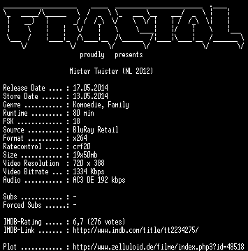 | FiLENAME: | Mister.Twister.German.2012.AC3.BDRip.x264-FRACTAL.mkv |
