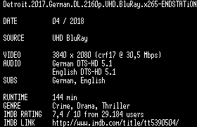 | FiLENAME: | Detroit.2017.German.DL.2160p.UHD.BluRay.x265-ENDSTATiON.mkv |
