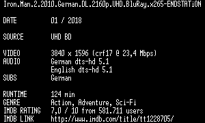 | FiLENAME: | Iron.Man.2.2010.German.DL.2160p.UHD.BluRay.x265-ENDSTATiON.mkv |
