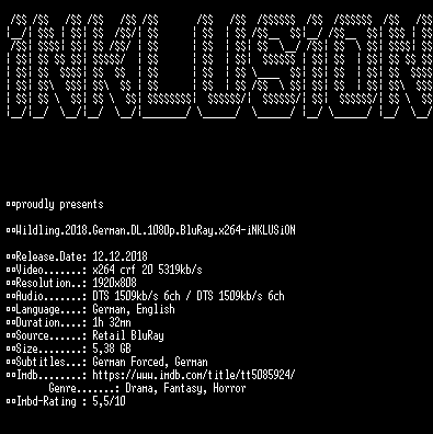 | FiLENAME: | Wildling.2018.German.DL.1080p.BluRay.x264-iNKLUSiON.mkv |