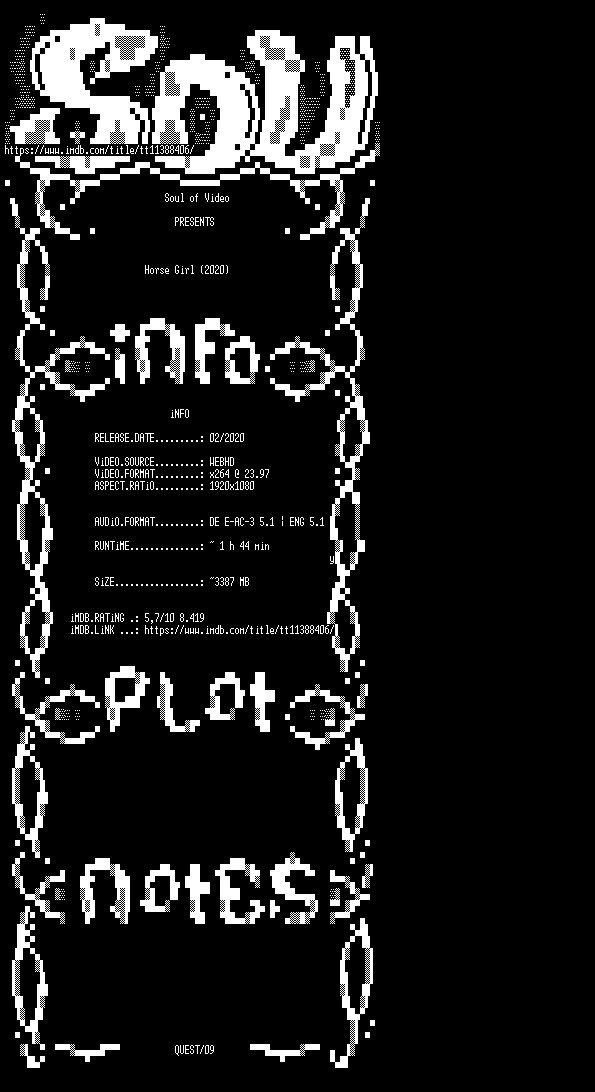 | FiLENAME: | Horse.Girl.2020.GERMAN.DL.1080p.WEB.x264.iNTERNAL-SOV.mkv |
