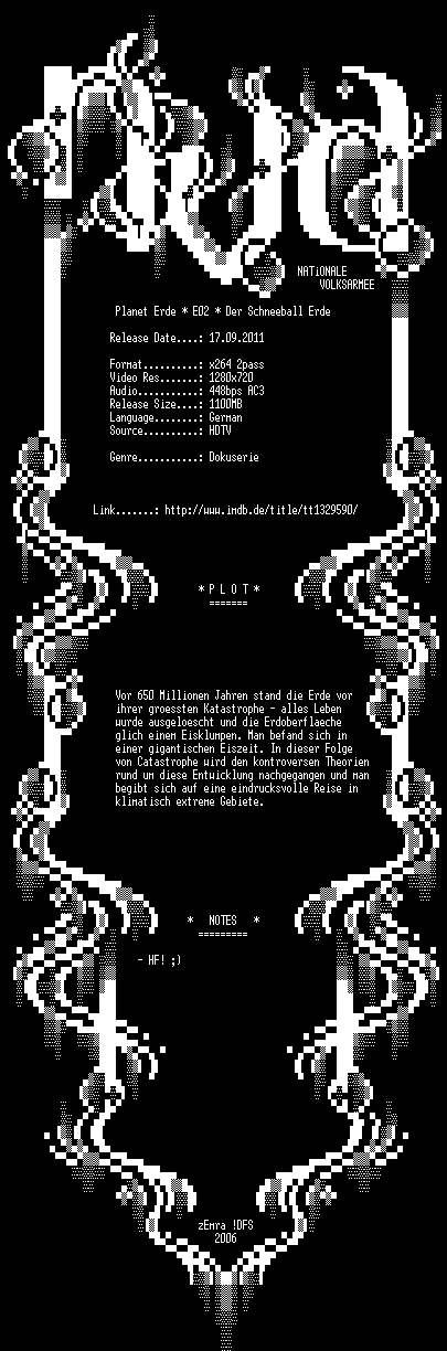 | FiLENAME: | Planet.Erde.E02.Schneeball.Erde.GERMAN.DOKU.AC3.HDTV.720p.x264-NVA.mkv |