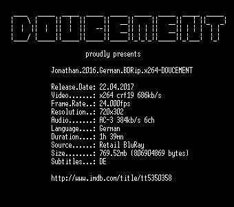 | FiLENAME: | Jonathan.2016.German.BDRip.x264-DOUCEMENT.mkv |